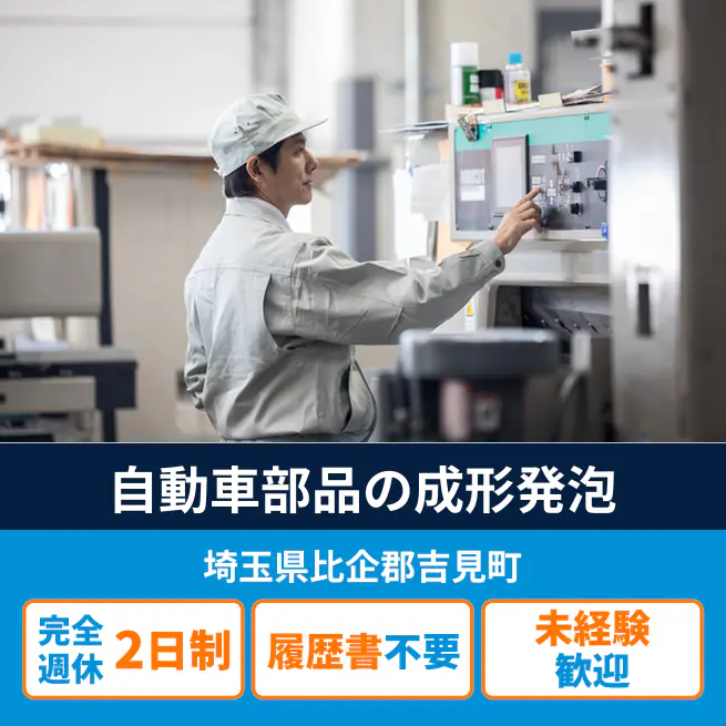 増員募集中!【自動車部品の成形発泡】【新天地で新しい自分に出会おう!】未経験からスタートOK★ちょっぴり残業でしっかり稼げる♪寮完備で生活も安心!