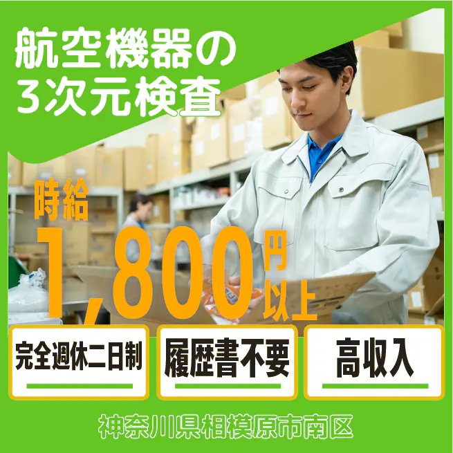 大手で安定勤務【航空機器の3次元検査】【安心の寮完備!】経験者歓迎♪スキルアップで高収入を目指そう!