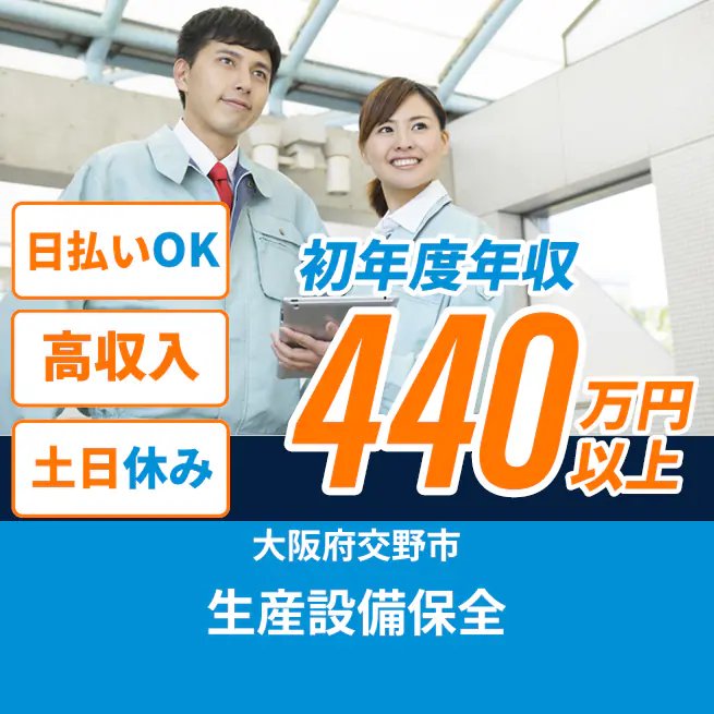 【生産設備の日常保全】 『年間休日約125日!日勤だけの機械メンテ』 #時給1980円 #20~40代活躍中 #経験が活きます #土日祝休み #改善業務もお任せ #残業少なめ #ExcelやWord使用あり #喫煙ルームあり #日払い可 (1)夜勤、膨大な残業、急な休日出勤全部なし!保全経験を活かして好条件 (2)収入もあきらめない!しっかり月収37.1万円以上可 (3)急な出費も安心◎スマホでカンタンに日払い申請OK ▽20~40代の男性スタッフが活躍中 機械の保全・メンテナンス経験を活かせるお仕事です。 新しいお仕事先が不安な方も、先輩スタッフや社員さんが しっかりサポートするのでご安心ください。 【受動喫煙対策】 受動喫煙対策あり(詳細は面接時) 将来の配置転換などによる変更の範囲 就業場所:全国/就業範囲:派遣先業務全般(詳細は就業条件明示書で明示する)