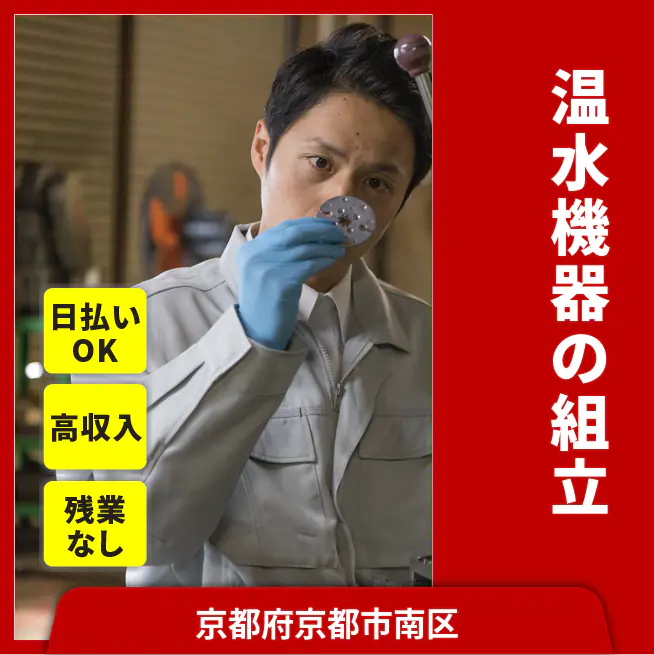 【業務内容】 温水発生機の組立と部品の仕分けを行う作業です。 <業務例一覧> - 必要な部品を棚から選び出し、各作業工程の準備を行います。 - 図面や指示書を確認しながら、部品を本体に取り付けて組み立てます。 - 専用の道具を使って、部品を固定するためのねじ穴を作成します。 - 温水発生機の組立作業を説明書に従って進めます。 - 未経験者でも安心して取り組めるように、丁寧な教育サポートを受けられます。 ATR3