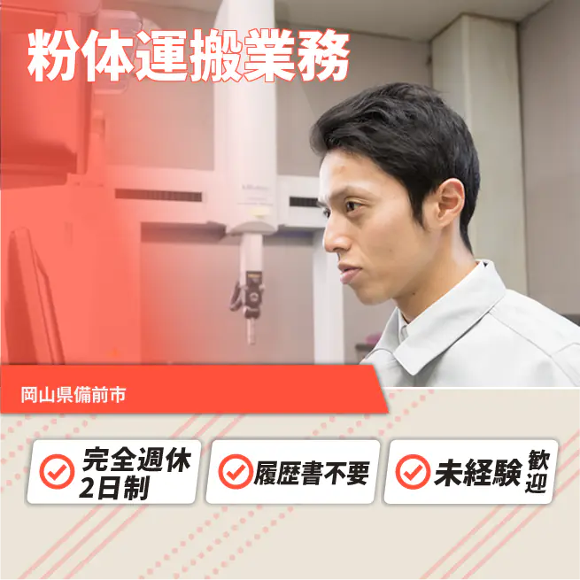 安心の週休2日【粉体運搬業務】仕事もプライベートも大切に!心地よい職場で新しいスタートを♪