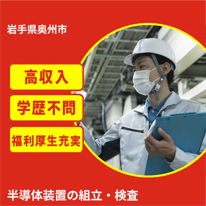 【業務内容】 半導体装置の組立・検査を担当し、クリーンルーム内で工具を使って作業を行います。 <業務例一覧> - 半導体装置の部品を組み立てる作業 - 組み立てた装置の動作確認と検査 - クリーンルーム内での作業準備とツールの管理 - 作業手順に従った安全で正確な作業の実施 - クリーンルームの環境維持と清掃業務 ATR3