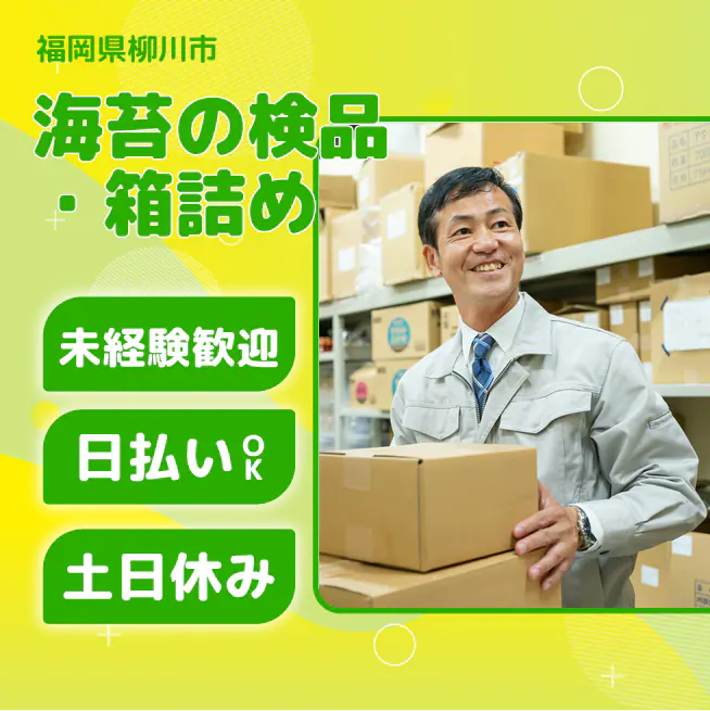 【海苔の検品・箱詰め】 『時短相談OK×残業ゼロ=家事との両立120点』 #地元で安定 #20~30代活躍中 #夕方5時半定時 #ピタ帰りOK #空調完備で一年中快適 #土日祝休み #柳川の海苔 #日払い利用OK #モクモク軽作業 (1)柳川の海苔を、食卓の主役へ!最後の「合格」を出す検品や補助の軽作業 (2)空調完備のクリーンな環境で、毎日快適な職場環境 (3)急な出費があっても大丈夫!スマホでサッと日払い申請できる安心感。 ▼モクモクと行う製造ワーク 人と話すより作業に集中したい。 そんなあなた、地元の名産品で モノづくりはじめてみませんか? 【受動喫煙対策】 受動喫煙対策あり(詳細は面接時) 将来の配置転換などによる変更の範囲 就業場所:全国/就業範囲:派遣先業務全般(詳細は就業条件明示書で明示する)
