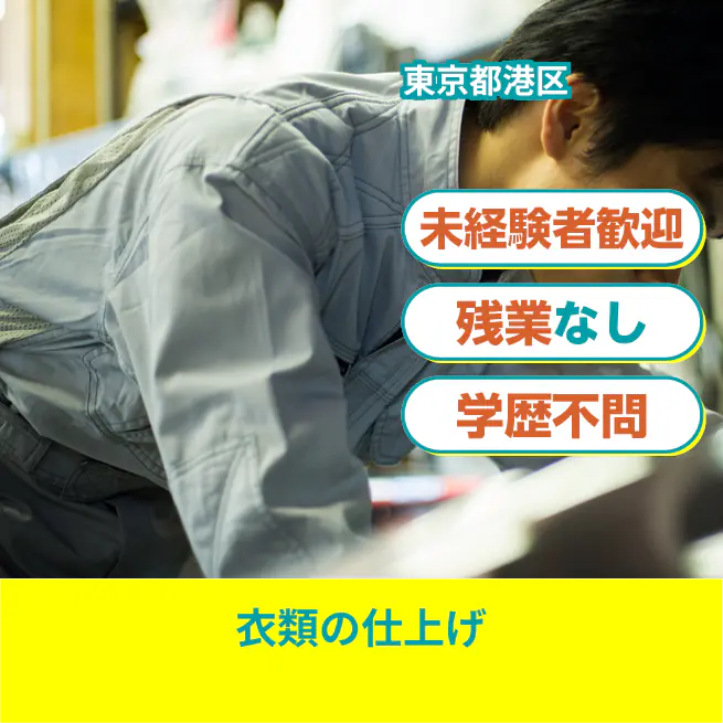 【業務内容】 業務用アイロンとプレス機を使用した衣類の仕上げ作業 <業務例一覧> - 業務用アイロンを使ってホテル従業員や宿泊客のユニフォームを仕上げる - 専用のプレス機を用いてワイシャツをプレスする - 衣類のしわを丁寧に伸ばす作業 - 有機溶剤を使用して衣類の染みを抜く - 仕上がりを確認し、品質をチェックする ATR3