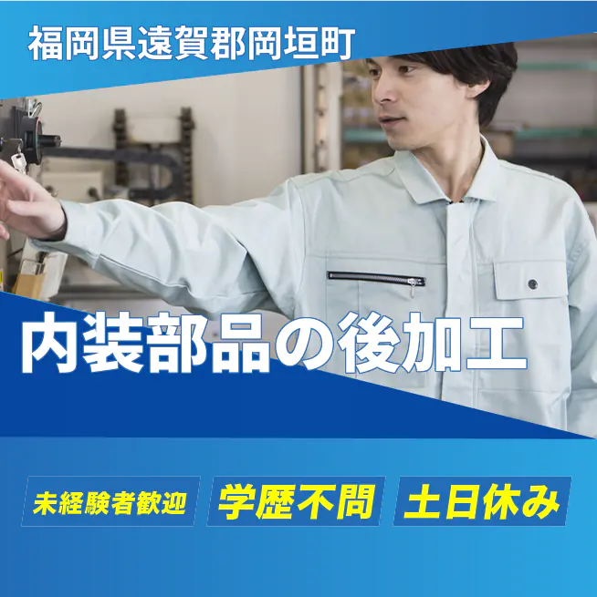 【業務内容】 自動車用内装部品の製造における後加工業務 <業務例一覧> - 成形機から出たプラスチック製品に布を付ける作業を担当します。 - 布から離型紙をはがし、小型のプレス機を使って布をプラスチックに圧着します。 - 布の側面を手作業でプラスチックに巻きつける作業を行います。 - 付属部品を用いて製品を組み立てる作業を担当します。 - 重なった布の角を振動溶着機で接着する作業があります。 - ウレタンから離型紙をはがし、基準線に沿ってシールを貼ります。 - 製品の外観をチェックし、箱詰めする重要な検査工程があります。 ATR3