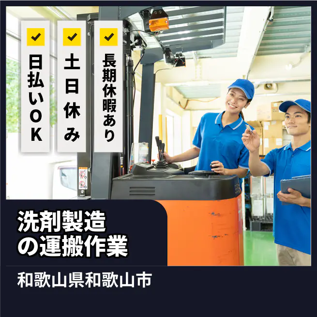 【洗剤などの製品詰め替え・運搬(日勤)】 / ◆月収25万円以上可能!しっかり稼げる♪ ◆日勤×土日祝休み!プライベートとの両立も◎ ◆フォークリフト免許を活かせます☆ ◆車通勤OK!無料駐車場完備 \ 石けんや洗剤といった製品づくりを支える材料準備・運搬のお仕事です! フォークリフトの使用経験がある方大歓迎☆★ 気になるお仕事内容は・・・ ・薬液や粉体などの原材料や製品をドラム缶へ詰め替え ・フォークリフトを使用した運搬作業 ・清掃など付帯作業 \おすすめポイント/ ・社員食堂完備!昼食準備の心配なし☆ ・男性が多数在籍している職場で、幅広い年代の方が活躍されています! ・年末年始・GW・夏季休暇など、長期休暇も充実♪ 石けん・洗剤製造の現場でフォークリフト資格を活かして働いてみませんか? 少しでも気になる方はぜひ!お気軽にお問い合わせください◎ ATR3
