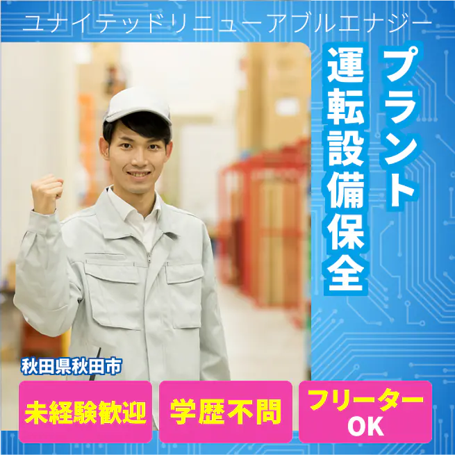プラント各種の点検・燃料乾燥設備のメンテンナンスをお任せします◎ 未経験からスタートできるお仕事です! \取扱事業/ バイオマス発電、電気事業者への売電 \具体的な仕事内容/ ・中央操作室でのプラント監視(ボイラー管理・電機保守等) ・プラント各種点検、重機(ローダー)を使用しての燃料供給作業 ・燃料乾燥設備のメンテンナンス及び保守 ※現在はまだ稼働10年未満の立ち上げ期ですが、安定創業期への事業フェーズ転換を図るべく増員採用となります。日勤2夜勤2明け1休み1を繰り返す勤務となります。 \ポジションの魅力/ ・秋田県内の未利用材を主燃料として再生可能エネルギーであるバイオマス発電を行い日常生活に不可欠な電力を供給するやりがいのある仕事です。 ・発電事業であり、会社の経営は安定しています。個人のノルマはありません。 ・勤務地は本社となりますので、秋田県外への外出や出張はほとんど発生いたしません。 ・事前の申請により個人の都合に合わせた有給休暇の取得が可能です。