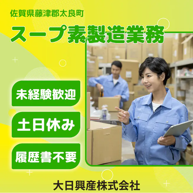 ~おすすめPoint~ ・転勤一切なし! ・未経験OK! ・OJT研修あり◎ ・資格取得支援あり! ・マイカー通勤OK! 当社工場にて、エキス(スープの素)の製造および材料仕込みを行って頂きます☆ 未経験歓迎!イチからスタートできます! 【事業内容】 エキス(スープの素)の製造 【具体的な仕事内容】 ■エキス(スープの素)製造 ・材料仕込み ┗材料投入時に10~20kg程度の重量物の運搬作業をして頂きます。 ・製品の箱詰め ・運送のための出荷準備作業等 ・製品の充填 ・原料の運搬 ※基本的に立ち作業での業務となります。 【1日の業務の流れ(一日)】 出社・朝礼 ↓ エキス製造・材料仕込み ↓ お昼休憩 ↓ 製造・箱詰め ↓ 材料運搬 ↓ 業務終わり次第退社