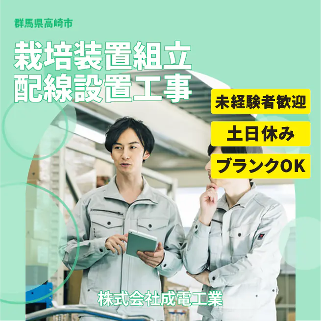 \おすすめPoint/ ・マイカー通勤OK ・スキルアップできる ・長期休暇完備 ・転勤なし ・未経験OK 自社開発を行うLED人工光栽培装置の組立配線と設置工事の業務をメインに行っていただくお仕事です☆ 未経験でも安心して就業していただけます◎ 【取扱事業】 各種制御盤の設計・製造 【具体的な仕事内容】 ◆Excelへ入力業務 ┗部品の発注依頼など ◆装置の組立 ┗栽培棚やタンクなどの組立作業 ◆装置内の電気配線 ◆お客様先への搬入と設置工事 ┗設置工事は数日~2週間程度の宿泊を伴う出張となる場合あり 【social kitchen(ソーシャルキッチン)とは】 自社開発の土を使わない完全室内型「LED人工光栽培装置」で、露地栽培のように天候や気象変化に影響されることはなく年間を通して安定的に生産できます◎ また、土を使わない水耕栽培で、農薬は使用しないので洗わずに食べることができ、手間いらずな上、野菜の味と栄養を損なうことがありません。 LED栽培では1年中さまざまな野菜を生産することができるため、旬に関係なく野菜を作り出すことができ近年注目を集めている技術です! 【入社後について】 まずは、先輩社員と二人三脚で各工程で実務を重ね、時間をかけて必要な知識とスキルを覚えていただきます。 将来的にはCADを使用した設計業務等にもチャレンジでき、業務の幅やスキルアップもできますので、未経験からスタートした社員も今では大活躍しています★
