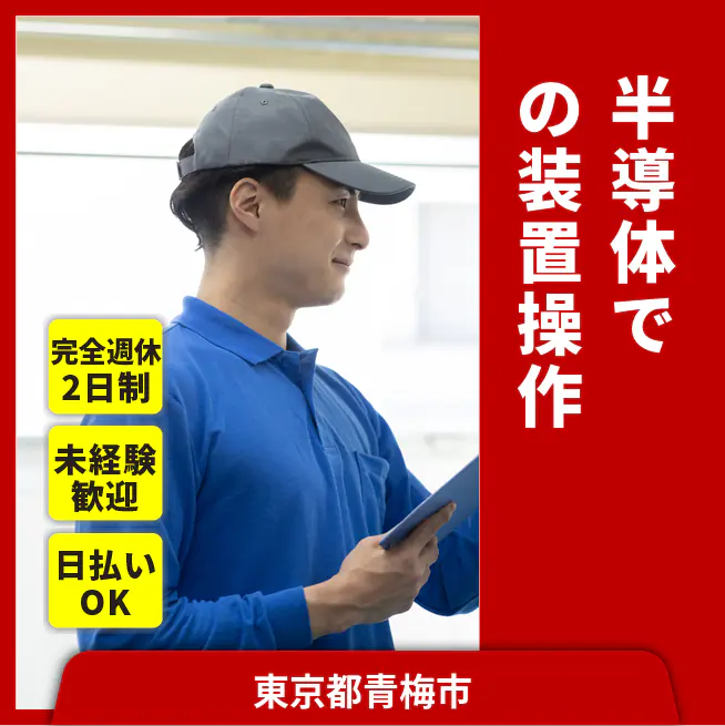 【業務内容】 半導体加工装置の操作と顕微鏡検査を行います。 <業務例一覧> ■クリーンスーツを着用 ■装置へウエハー投入 ■条件を端末入力 ■加工後に顕微鏡検査 ■工程内ログを保存 ■ツール周辺をIPA清掃 既存業務拡大に伴う増員募集 ATR3