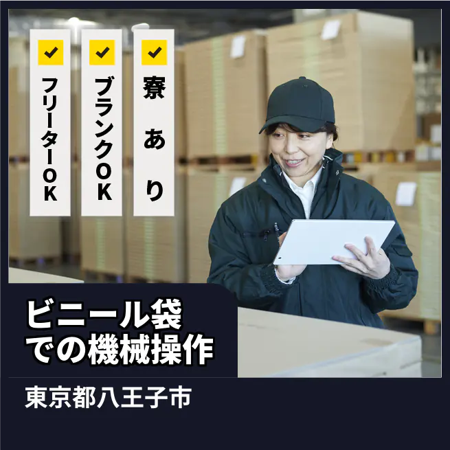 【業務内容】 ポリエチレン袋の成型機オペレーターと搬入作業です. <業務例一覧> ■フィルム押出機の温度設定 ■ラベルプリンタで品番発行 ■出来上がり袋を目視検査 ■パレット積みし倉庫へ搬入 ■倉庫でロケーション管理 ■協力して積み上げ整理 《勤務条件・環境》 チーム作業で体を動かす ATR3