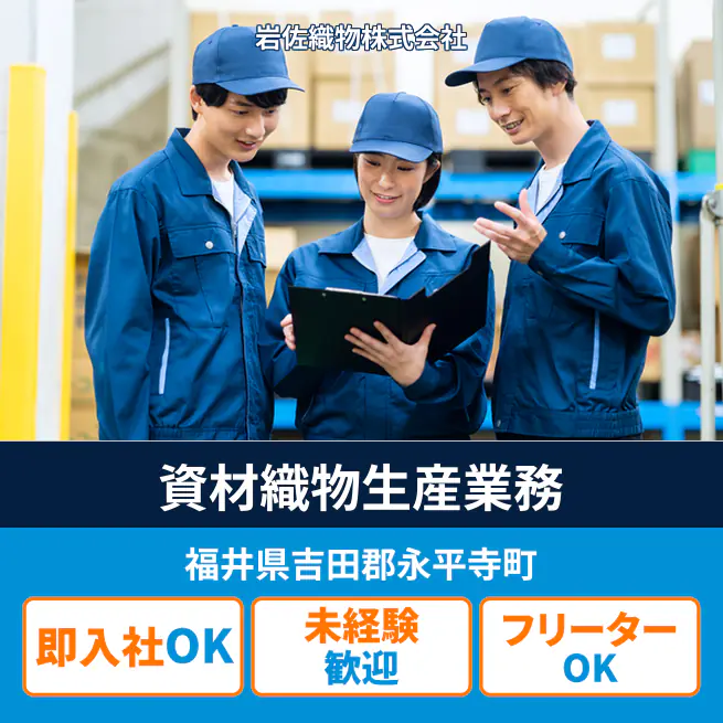 ~おすすめPoint~ ・未経験OK ・退職金制度有 ・昭和38年創業の老舗企業 ・OJT研修有 ・転勤なし 当社の製造担当として、エアバッグや建築現場用養生布などの製造に携わっていただきます! 経験ない方も安心してご応募ください★ 【取扱商材】 産業用資材織物(エアバッグ、建築現場用養生布等) 【具体的な仕事内容】 ◇生産スタッフ(織布生産の現場作業) ┗機械の見廻り、糸のセット、切れた糸の補修等 ┗機械の保全、調整等 ★まずは生産スタッフとして勤務いただき、適性や意欲次第では多様なキャリアパスへ進んでいただける可能性がございます。 例:工場長、生産管理、工程設計など 【教育体制】 ◎経験がなくても、先輩社員が丁寧に指導しますのでご安心ください。 ◎先輩社員からのOJTで、未経験からでもスキルをしっかりと身に着けていただける環境です! ◎まずはOJT等の研修で基本的なスキルを身に着けていただき、スキルやご希望に応じて徐々にお任せする業務を増やしていく予定です☆ 【募集背景】 ◎スタッフの高齢化に伴う増員募集です。次世代の育成とともに、製造技術の伝承をしていきたいと考えています! ◎次世代の中心を担える方、製造業でのスキルを身に着けたいという意欲をお持ちの方からの積極的なご応募をお待ちしております。