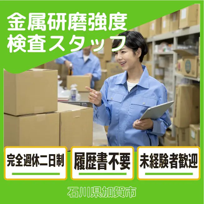 【金属研磨強度検査スタッフ】【未経験OK】土日祝休み&適度な残業で収入アップ!予定が立てやすい