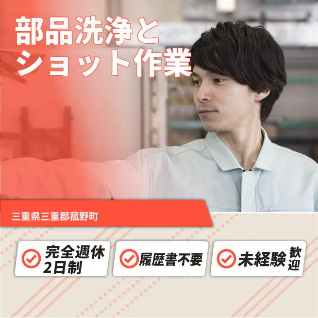 【業務内容】防炭作業後の自動車部品の洗浄およびショット作業 <業務例一覧> - 防炭処理が完了した自動車部品を洗浄機にセットして水洗浄を行う - ショット作業による表面処理を実施する - 洗浄後の部品の品質確認を行う - 洗浄機やショット機械の簡易メンテナンスを行う - 作業場の整理整頓と安全確認を行う ATR5