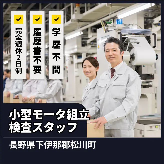 【小型モータ組立検査スタッフ】【小型モーター組立☆】女性多め♪残業ほぼナシ×土日祝休み!/履歴書不要