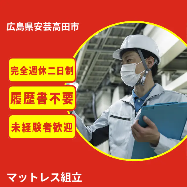 【概要】 マットレス組立の補助工程。カバーとスプリングの組み合わせ・縫い合わせを行います。 【業務内容例】 カバー/内部材のセット 二人組での反転・縫合 最終外観確認 梱包・搬送 ATR5