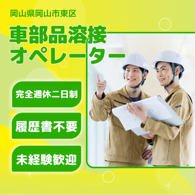 【業務内容】 車用メタルパーツの溶接機械の操作と検品作業 <業務例一覧> - 車用メタルパーツの溶接機械を操作し、正確に溶接を行う - 溶接後の部品を検品し、品質を確認する - 機械の簡単なメンテナンスを行い、正常に稼働させる - 作業記録をつけて、進捗状況を管理する - 安全基準に従い、作業環境を整える ATR5