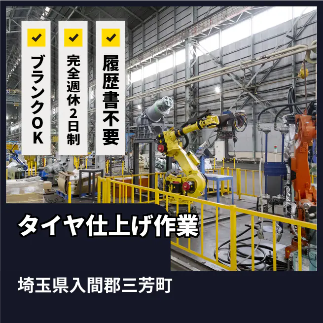 【業務内容】中古タイヤを再生するための後工程を担当する仕事です。 <業務例一覧> - 古いタイヤの目視検査を行い、再生可能かを確認する - 機械を使用してタイヤの状態をチェックする - 検査後のタイヤを仕上げる作業を担当する - 60kgほどのタイヤを転がして移動させる - トラックやバス用のタイヤを取り扱う ATR5