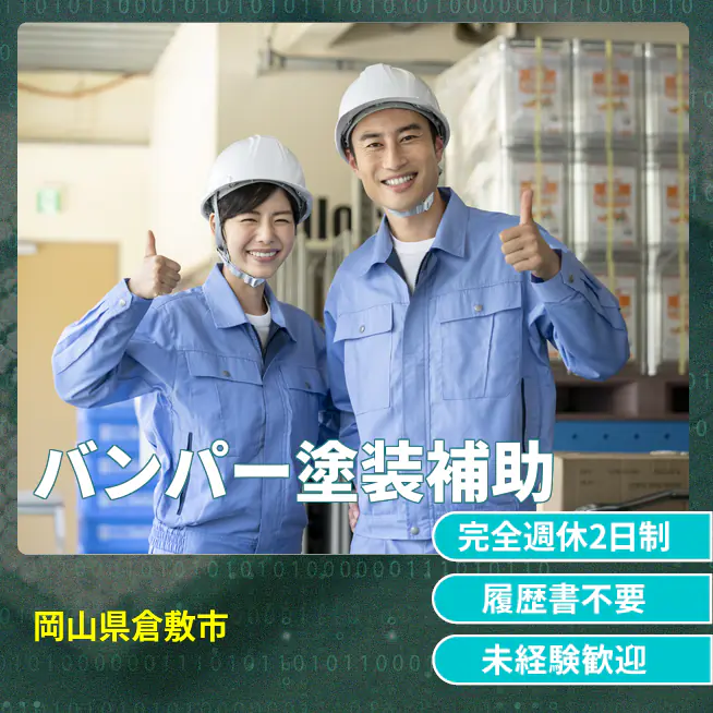 【業務内容】自動車バンパーの塗装補助と品質チェック業務 <業務例一覧> - 自動車バンパーの塗装が不要な部分にマスキングを行う作業 - 塗装後のバンパーに不備がないか確認する検査作業 - 塗装前のバンパーを機械にセットする準備作業 - 塗装機械の稼働状況をモニタリングし、異常がないか確認 - 作業場所の清掃と整理整頓を行い、作業環境を整える ATR5