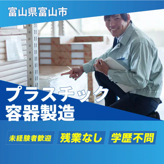 【業務内容】 芳香剤用プラスチック容器の製造と製品の梱包作業を行います。 <業務例一覧> - 芳香剤用のプラスチック容器を生産ラインで製造する - 完成したプラスチック容器を検品して品質を確認する - 製造された容器を梱包用の箱に詰める - 出荷用の箱を準備し、製品を丁寧に積み替える - 梱包された箱を出荷エリアに移動させる ATR3