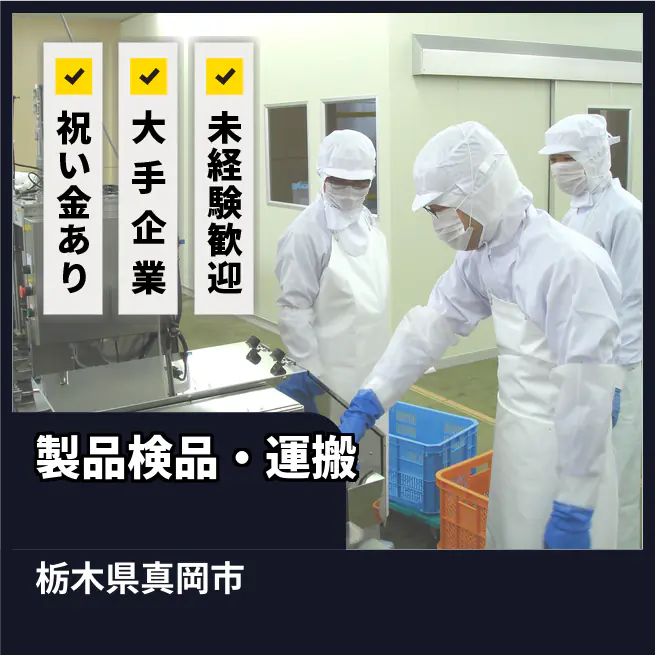 【業務内容】 製品の検品および製造関連作業を担当します。 <業務例一覧> ・完成した製品の品質を確認する検品作業 ・製品をコンテナに詰める作業 ・製品を決められた場所に運ぶ運搬作業 ・午前中に機械を洗浄し、清潔な状態を保つ作業 ・午後に製品の製造プロセスをサポートする作業 ATR3