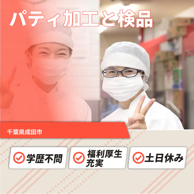 【業務内容】 ハンバーガー用パティの製造工程を担当します。 <業務例一覧> - 入荷した冷凍肉(20kg)を専用の台に載せる作業 - 大きな包丁のような道具を使用して冷凍肉を加工 - 加工した肉をミンチ機に投入する作業 - 計量器を使ってミンチを指定の分量に分ける作業 - 機械で製造されたパティを目視で検査する作業 - 検査済みのパティを箱に詰める作業 ATR3