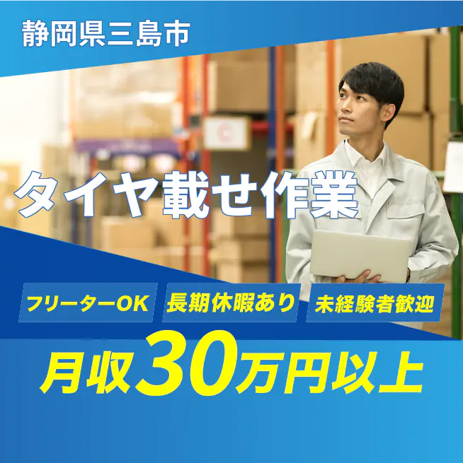 【エリアPR】 ◎顧客企業への直接雇用あり、正社員も目指せます! 東京証券取引所プライム市場に上場している優良企業です 1.社宅家賃補助上限50,000円(単身・家族) 2.電車通勤可能(近くに駅があり、交替勤務でも電車通勤可能) 3.観光できる場所が多い(三島大社・韮山反射炉・柿田川等) 4.周りに店が多く車がなくても生活に困りません 5.筋肉をつけたい方、痩せたい方にお勧め 6.食堂や売店、また喫茶コーナーもあります。 【受動喫煙対策】 有:屋内禁煙(屋外に喫煙場所あり) 将来の配置転換などによる変更の範囲 就業場所:無/就業範囲:無