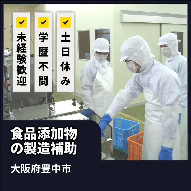 安心の昼間勤務【食品添加物の製造補助】新しいスタートを応援!寮完備で安心♪年間120日以上のお休みでプライベートも充実★未経験からのチャレンジ大歓迎!