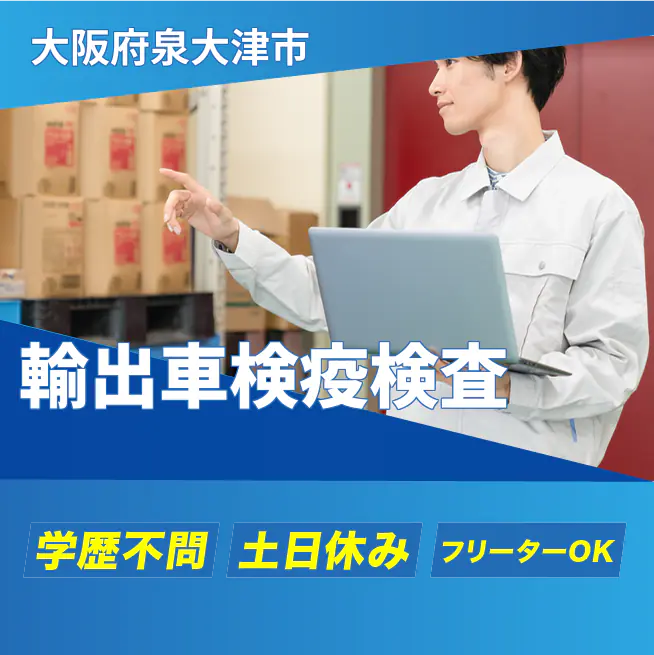 【業務内容】 輸出車の検疫検査を行う仕事です。 <業務例一覧> - 車内やボンネット内の虫の目視確認 - 噴霧器を使用して殺虫剤を塗布 - 車のキズやへこみなどの損傷を点検し、写真撮影 - 検査内容をスマホやタブレットでシステムに入力 - 冬季はコンテナ内で車を90℃まで温めて虫を駆除 - 必要に応じて車の移動や業務車両の運転 車通勤OK 交通費支給あり 慣れない業務でもしっかりサポートしますので、安心して就業できます! また、プライベートと両立のしやすい環境です。 少しでもご興味がある方はお気軽にご応募、ご相談ください! ★週払い制度あり! お給料日前に働いた分の一部を受け取れるシステムです。 お仕事を初めてすぐの時や、急な出費の時も安心◎ ATR3