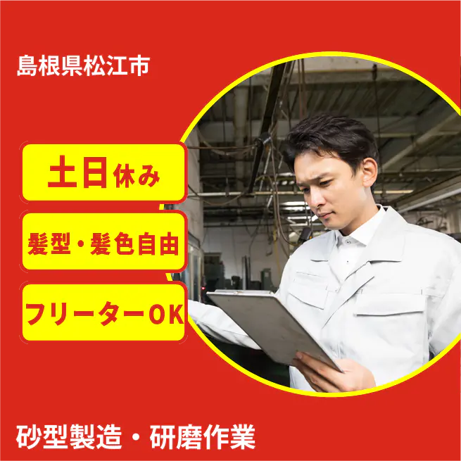 【業務内容】 鋳造および機械加工の工程での製品製造補助と仕上げ作業 <業務例一覧> - 鋳造用の型枠に砂を入れ、固めて砂型を作る作業 - 成形された製品を砂型から取り出し、表面の砂を除去する作業 - 機械加工で使用する円柱状の金属部品をグラインダーで研磨する作業 - 研磨後の部品のバリを取り除く作業 - 仕上がった製品の外観を確認し、品質をチェックする作業 ATR3