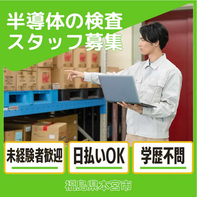 【月収27万可】男女活躍★未経験歓迎の高時給ワーク! 【半導体の加工・検査】 <お仕事内容> 半導体の製造補助 【具体的なお仕事内容】 ◎マシンオペレーター ・モニター付きの機械を操作します ・機械にICチップとなる部材の束を設置し、マシンが基盤に搭載していきます ・異常があればランプで知らせてくれ、モニターの音声に従って操作をします ◎半導体の検査作業 ・機械にエラーがあった際や完成品の最終検査をおこないます ・機械や作業台に設置されている拡大鏡を使って検査をします ※完成品は指先程からゴマ粒くらいの小さなサイズまであります。 ◎スマートメーターの検査作業 ・家や建物などについている、電気使用量を表示する機械の検査となります ・拡大鏡などを使い完成品の検査作業を行います ※5勤2休または、4勤2休のどちらかの勤務形態になります。 希望の勤務形態があれば相談可能です! 【職場環境】 ・本宮駅から職場まで約3㎞(車で7分) ・男女比率:男性8割 女性2割 ・休憩室あり ・更衣室あり ・ロッカーあり ・作業服無料貸与 ・無料駐車場あり ・防塵着を着用し、クリーンルーム内での業務 ATR3