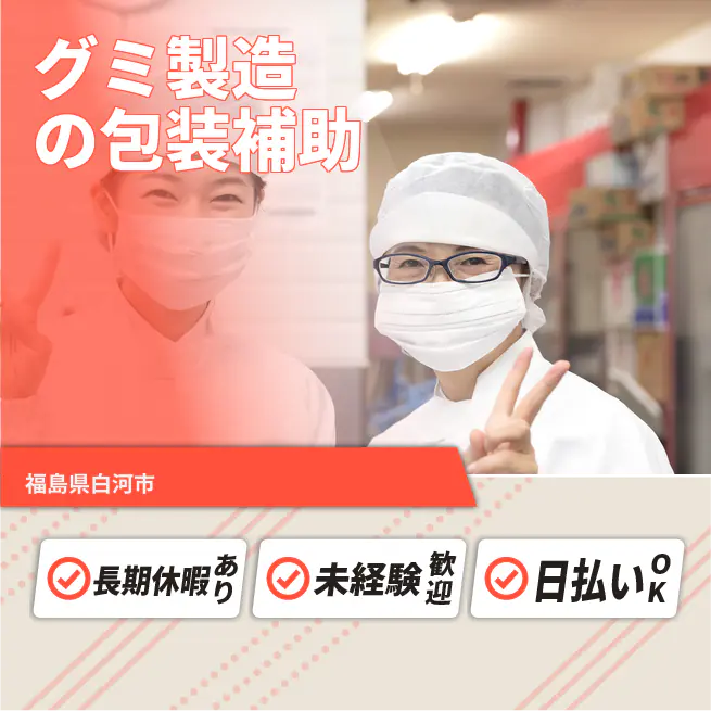【グミ製造スタッフ】 原料投入・マシンオペレーターと目視検査・梱包補助を担当。空調完備で年間快適。 \アピールポイント/ ★職場見学で事前確認可 ★軽作業中心で体力負担少 ★男女比5:5で働きやすい" ATR3