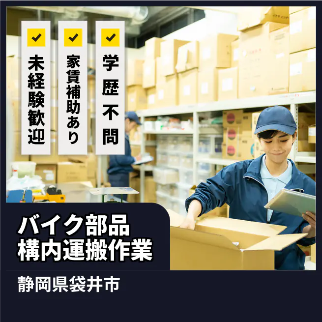 【職場はこんな感じ】 バイクに使用される部品などを集める軽作業。 種類別に仕分けし梱包、ハンディなどの端末を使用して簡単な入力 台車やハンドリフト、フォークリフトで構内運搬作業 【いろんな方が働いています】 ◇工場内製造で加工や組立、オペレータ―などをしていた方 ◇軽作業や検査をしている方 ◇精密部品やメディカル部品をあつかっていた方 ◇ 倉庫でフォークリフトをしていた方 ◇トラックなどに乗って運送していた方 ◇飲食店で数日のアルバイトをしていた方 ◇コンビニやスーパーなどの小売りやレジ打ちをしていた方 ◇交通整理や警備についていた方 ◇工場は初めてという方もいます などなど皆さんの経験は多数です! ATR3