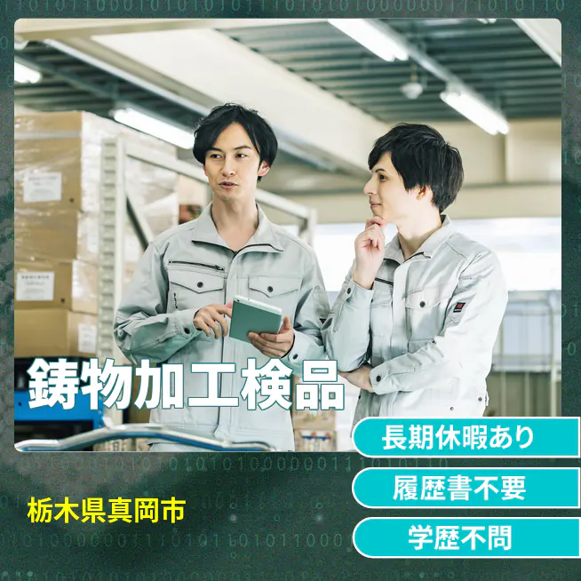 【概要】 自動車用鋳物部品の加工・検査。小物~両手持ちサイズを扱います。 【業務内容例】 加工機へのセット・取り出し 目視検査 梱包 測定・ゲージ確認 工程記録・清掃 【その他情報】 男女比:男9:女1 年齢層:20~50代 雰囲気:単独モクモク作業 特徴:受注安定/正社員登用あり 福利厚生:食堂・売店・大浴場・駐車場 ATR3