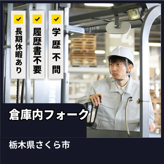 ≪栃木県さくら市エリア≫ 大手物流倉庫内でのフォークリフトオペレーターです。 紙製品・衛生製品の入庫、出庫、出荷作業をお願いします。 <主な作業> ・フォークリフトで倉庫内荷物の出庫 ・トラックへの出荷積み込み作業 合間に、数量確認や資材補充、出荷準備等の軽作業もお任せします。 研修教育制度があるため、安心してお仕事スタートできます! 多少の体力仕事がありますが、女性スタッフも活躍中♪ <1日の流れ(一例)> 7:30始業・作業開始→10:00休憩→10:10業務再開→12:00昼休憩→13:00業務再開→14:30休憩→14:40業務再開→16:15終業 <職場環境> 男女比:男性7割/女性3割 年齢層:20代、30代、40代、50代の幅広い世代が活躍中! 雰囲気:作業は個人で黙々ですが、明るく風通しの良い雰囲気! 特徴:日勤のみ!日曜日はお休み確定です♪ 魅力:シフトの融通が利くのでライフスタイルに合わせてお休みが取りやすい環境です♪ <オススメポイント> ・学歴不問(中卒・高卒) ・フォークリフト免許必須 ・製造業、工場、現場作業員、倉庫内作業、軽作業などの経験がある方、積極採用中! フォークの資格を活かしたい方!男女問わず大歓迎! ATR3