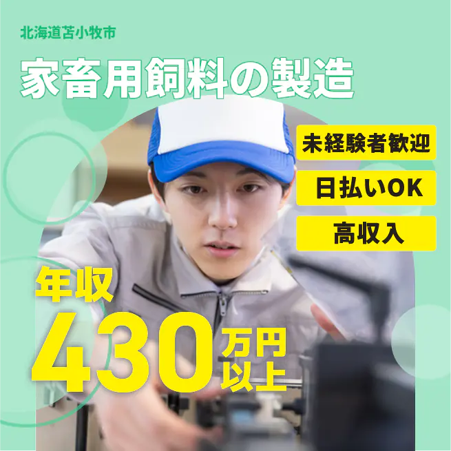 【家畜用飼料の製造スタッフ】 ≪お仕事内容≫ 主に酪農家向けの家畜用飼料を製造している工場で、 家畜用飼料の製造・調合・運搬業務をお願いします。 \高時給×安定ワーク×未経験歓迎/ 初めてでも安心♪しっかりとした研修制度あり◎ まずは、最初のステップに最適な、 原料の計量⇒規定量を混ぜるダケ!シンプル作業からお任せします♪ 【具体的なお仕事内容】 ・飼料原料にサプリメント等を分量ごとに計量・調合 ・原料を釜へ投入する作業 ・原料倉庫での原料搬送(リフトオペレーター業務) ・その他、付随する工場内作業全般 ※フォークリフト免許を持ちの方は、リフト運搬作業もお任せします♪ ※製造ラインは複数あり、適性やスキルに応じて配属されます。 【職場環境】 ・沼端駅から車で約13分 ・休憩室完備 ・更衣室、ロッカーあり ・作業服無償貸与(防塵マスク着用) ・屋内喫煙所あり ・安心の研修制度(1ヶ月程度の作業研修あり) ・無料駐車場完備 ┗自宅通勤者・入寮者いづれも自家用車通勤必須 ATR3
