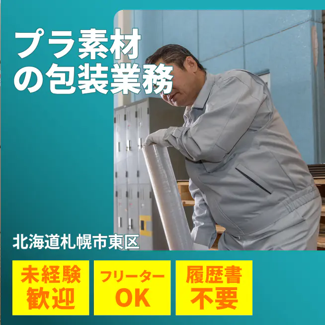 【業務内容】 プラスチック製品製造工場での製品梱包作業を担当します。 <業務例一覧> - ロール状のプラスチック製品を専用の梱包紙で包む作業を行います。 - 梱包用機械に部品(エアシャフト)を取り付ける作業があります。 - 出来上がった製品に関する数値をパソコンに入力します。 - エアシャフトを持ち上げる作業があり、30キロ程度の重量物を扱うことがあります。 - 梱包作業の効率を高めるための機械操作や設定を行います。 ATR3