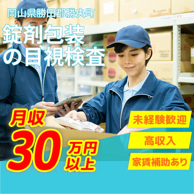 【業務内容】 医薬品メーカーの工場でジェネリック医薬品やサプリメントの製造業務を行います。 <業務例一覧> - ベルトコンベアで流れてくる錠剤の個包装シートが規定通りに包装されているかを目視で検査します。 - 個包装シートの枚数を確認し、箱詰め作業を行います。 - 2名体制でベルトコンベアの前に立ち、作業を行います。 - 配属間もないスタッフの作業フォローを行います。 - 安全基準や手順に従い、製造工程を進行します。 ATR3