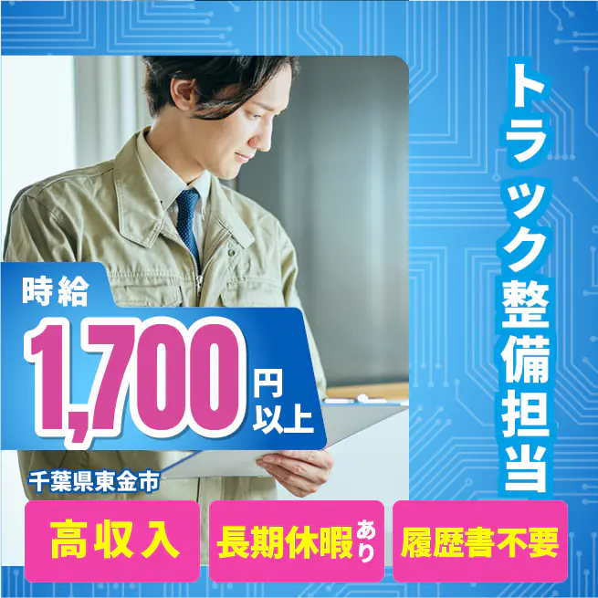 【業務内容】 大手トラックメーカーのカスタマーセンターでの整備・メンテナンス業務 <業務例一覧> - トラックの定期点検を行い、必要な整備を実施する - 不具合が発生したトラックの診断と修理を行う - 車検に関連する作業を担当し、車両が法的基準を満たすようにする - 見習い整備士へのOJT(オン・ザ・ジョブ・トレーニング)を通じた教育を行う - 専門的な整備作業を受け持ち、技術力の向上を図る - 整備業務を通じて、2級整備士取得に向けた実務経験を積む ATR3